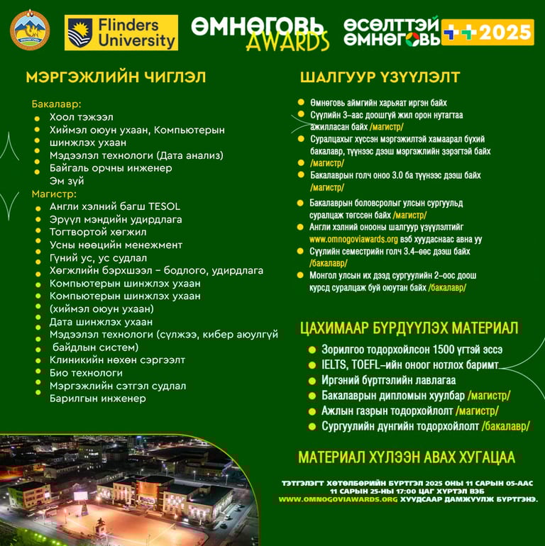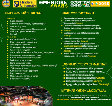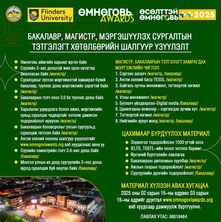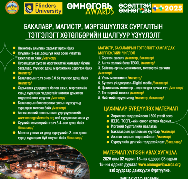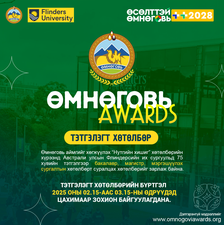 Флиндерсийн их сургуулийн хувьд зөвхөн Өмнөговь аймгийн залуучуудад 25 хувийн сургалтын төлбөрийн тэтгэлгийг олгож байгаа бол орон нутгийн зүгээс 25-50 хувийн тэтгэлгийг тухайн оюутанд олгохоор төлөвлөж байна.